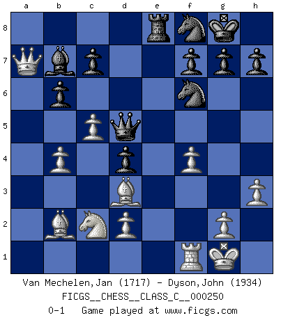 Last move : 0-1 2018 May 30 12:18:2 [Event "FICGS__CHESS__CLASS_C__000250"] [Site "FICGS"] [Date "2018.03.22"] [Round "1"] [White "Van Mechelen,Jan"] [Black "Dyson,John"] [Result "0-1"] [WhiteElo "1717"] [BlackElo "1934"] 1.c4 e5 2.Nc3 Bb4 3.Nd5 Bc5 4.e3 Nf6 5.b4 Be7 6.Nxe7 Qxe7 7.Bb2 O-O 8.a3 d6 9.Ne2 a5 10.Ng3 axb4 11.axb4 Bg4 12.f3 Rxa1 13.Qxa1 Bc8 14.Bd3 Re8 15.O-O Nbd7 16.f4 b6 17.Qa7 exf4 18.Nf5 Qd8 19.exf4 Nf8 20.Ne3 d5 21.c5 d4 22.Nc2 Qd5 23.h3 Bb7 0-1 English, Kramnik-Shirov counterattack Kingside Castling by player Black (move 7) Kingside Castling by player White (move 15) Player Black won this chess game. Follow this game move after move (download)The Pin is mightier than the sword. (Fred Reinfeld) Das Schach hält seine Meister in eigenen Banden, Fesseln; auf vielerlei Weise formt es ihren Geist, so dass die innere Freiheit selbst des Stärksten beeinflusst wird. (Albert Einstein) Un jugador que trata de regresar una movida en el Ajedrez es un futuro carterista. (Richard Fenton) La vie et les Echecs sont tous les deux une lutte constante. (Lasker) The message for business people contemplating their place in the cyberspace is simple and direct: get linked or get lost. (Vic Sussman and Kenan Pollack)