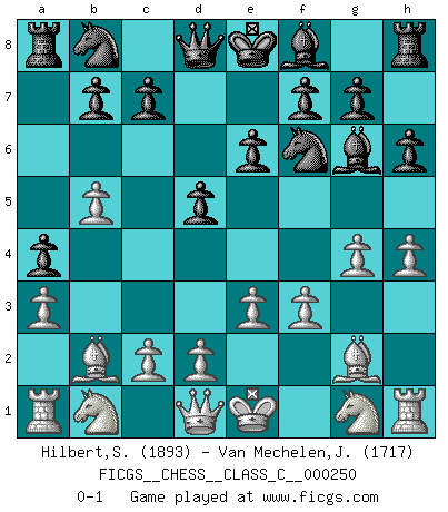Last move : 0-1 2018 May 14 19:38:50 [Event "FICGS__CHESS__CLASS_C__000250"] [Site "FICGS"] [Date "2018.03.22"] [Round "1"] [White "Hilbert,Stephan J."] [Black "Van Mechelen,Jan"] [Result "0-1"] [WhiteElo "1893"] [BlackElo "1717"] 1.b4 a5 2.b5 a4 3.a3 d5 4.e3 Bf5 5.g4 Be4 6.f3 Bg6 7.h4 h6 8.Bb2 e6 9.Bg2 Nf6 0-1 Polish (Sokolsky) opening Player Black won this chess game. Follow this game move after move (download)The Pawns are the soul of the game. (Francois Andre Danican Philidor) Ich möchte Schüler heranbilden, die das Vermögen haben, selbst zu denken und Kritik zu üben. (Emanuel Lasker) Repentinamente, me resultaba obvio en mi analisis que yo había pasado por alto lo que Fischer había visto en el tablero con la mas grande facilidad. (Mikhail Botvinnik) Psychologiquement, tu dois avoir confiance en toi même, mais cette confiance doit être basée sur des faits. (Robert Fischer) What doesn't kill us makes us stronger. (Friedrich Nietzsche)