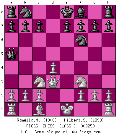 Last move : 1-0 2018 May 19 11:35:19 [Event "FICGS__CHESS__CLASS_C__000250"] [Site "FICGS"] [Date "2018.03.22"] [Round "1"] [White "Ramella,Mariano"] [Black "Hilbert,Stephan J."] [Result "1-0"] [WhiteElo "1800"] [BlackElo "1893"] 1.e4 d5 2.exd5 Qxd5 3.Nc3 Qa5 4.d4 Nf6 5.Nf3 Bf5 6.Bd3 Bxd3 7.Qxd3 1-0 This chess game has been lost on time (started : 2018.03.22 2:38:46) Scandinavian defense Player White won this chess game. Follow this game move after move (download)Kasparov : J'adoube , Ivanchuk : S'il vous plaît ! (Garry Kasparov & Vassily Ivanchuk, Linares 1997) Ich brauche nur einen Blick auf das Schachbrett zu werfen, und weiß schon, was in der Stellung steckt, was geschehen kann und was geschehen wird. Alle übrigen suchen und prüfen, ich aber weiß es! (José Raúl Capablanca) El Ajedrez demanda una total concentración. (Bobby Fischer) Botvinnik disait en comparant les échecs à la musique: Il existe une science dont le but est l'étude de l'acoustique et des sons. Mais il y a aussi un art qui se sert de l'océan des sons : c'est la musique. De toute évidence, il en est de même pour la pensée. La logique est l'étude des lois de la réflexion et les échecs reflètent, en tant qu'art, le côté logique de la réflexion, sous la forme d'images artistiques... Extrait de Fischer - Spassky, Reykjavik 1972 par Alexander & F. Wyndham (Ed. Solar), p 37. All maxims have their antagonist maxims; proverbs should be sold in pairs, a single one being but a half truth. (William Mathews)