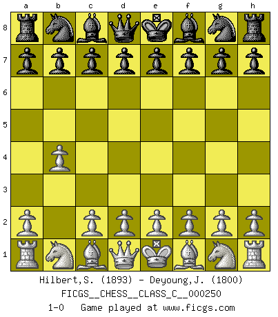 Last move : 1-0 2018 June 10 14:9:44 [Event "FICGS__CHESS__CLASS_C__000250"] [Site "FICGS"] [Date "2018.03.22"] [Round "1"] [White "Hilbert,Stephan J."] [Black "Deyoung,Joseph"] [Result "1-0"] [WhiteElo "1893"] [BlackElo "1800"] 1.b4 1-0 This chess game has been lost on time (started : 2018.03.22 2:38:46) Polish (Sokolsky) opening Player White won this chess game. Follow this game move after move (download)Fischer is the strongest player in the world. In fact, the strongest player who ever lived. (Larry Evans) Wenn sie aufgeben, dann danke ich Ihnen für das Spiel (Eventualzug beim Fernschach). (Anonymous) El Ajedrez es tan interesante por sí solo, que no es necesario un interés monetario para persuadir a una persona a que lo practique; por lo tanto, nunca se juega por dinero. (Benjamin Franklin) Je fais ceci parce que dans cinquante coups j'obtiendrai cela; je m'appelle Mikhail Moisevitch Botvinnik. (Botvinnik) If you lose the game you should win the analysis! (Proverb)