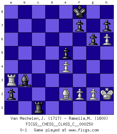 Last move : 0-1 2018 May 21 11:46:40 [Event "FICGS__CHESS__CLASS_C__000250"] [Site "FICGS"] [Date "2018.03.22"] [Round "1"] [White "Van Mechelen,Jan"] [Black "Ramella,Mariano"] [Result "0-1"] [WhiteElo "1717"] [BlackElo "1800"] 1.c4 Nf6 2.Nc3 g6 3.e4 d6 4.d4 Bg7 5.Nf3 O-O 6.Be2 Nbd7 7.O-O e5 8.Re1 exd4 9.Nxd4 a6 10.Bg5 c5 11.Nc2 Qc7 12.Ne3 Nb6 13.Bxf6 Bxf6 14.Ncd5 Nxd5 15.Nxd5 Qd8 16.Nxf6+ Qxf6 17.Qd2 Rd8 18.Rad1 Qe7 19.Bf3 Be6 20.b3 Rab8 21.Qf4 b5 22.h4 bxc4 23.bxc4 Bxc4 24.h5 Bxa2 25.h6 Qe5 26.Qxe5 dxe5 27.Rc1 Rdc8 28.Rc2 Bb3 29.Rc3 a5 30.Bg4 Rc7 31.Rec1 a4 32.Rxc5 Rxc5 33.Rxc5 a3 34.Ra5 a2 35.Be2 Kf8 36.Kh2 Rc8 37.Ra3 Rc1 0-1 English Opening Kingside Castling by player Black (move 5) Kingside Castling by player White (move 7) Player Black won this chess game. Follow this game move after move (download)Place the contents of the Chess box in a hat, shake them up vigorously, pour them on the board from a height of two feet, and you get the style of Steinitz. (H. E. Bird) Das typische an einem Großmeister ist, daß er eine gewonnene Position schnell und schmerzlos gewinnt. (Irving Chernev) Antes de los Finales, los dioses han colocado el Juego Medio. (Siegbert Tarrasch) Nous sommes les pions de la mystérieuse partie d'Echecs jouée par Dieu. Il nous déplace, nous arrête, nous pousse encore, puis nous lance un à un dans la boîte du Néant. Epitaphe sur la tombe de David Janowsky (1868-1927). But they are useless. They can only give you answers. (Pablo Picasso, about computers)