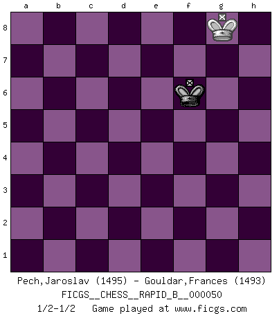 Last move : 1/2-1/2 2007 September 24 11:40:56 [Event "FICGS__CHESS__RAPID_B__000050"] [Site "FICGS"] [Date "2007.04.30"] [Round "1"] [White "Pech,Jaroslav"] [Black "Gouldar,Frances"] [Result "1/2-1/2"] [WhiteElo "1495"] [BlackElo "1493"] 1.d4 d5 2.c4 e6 3.Nc3 Nf6 4.Nf3 Nbd7 5.Bg5 Be7 6.e3 O-O 7.Rc1 c6 8.Bd3 dxc4 9.Bxc4 Nd5 10.Bxe7 Qxe7 11.O-O Nxc3 12.Rxc3 e5 13.Qc2 exd4 14.exd4 Nb6 15.Re3 Qf6 16.Bb3 Bf5 17.Qc5 Rfe8 18.Ne5 Be6 19.Rf3 Qg5 20.Nxf7 Qxc5 21.dxc5 Bxb3 22.axb3 Nd5 23.Nd6 Re7 24.h3 b6 25.Rc1 Rd7 26.Rd3 Rad8 27.Ne4 Nb4 28.Rxd7 Rxd7 29.f3 h6 30.Ra1 bxc5 31.Nxc5 Rd5 32.Ra4 Rxc5 33.Rxb4 Rc2 34.Ra4 Rxb2 35.Rxa7 Rxb3 36.Rc7 Rc3 37.h4 c5 38.h5 c4 39.Kh2 Rc1 40.Kh3 c3 41.Kg4 Rc2 42.g3 Kf8 43.Rc4 Ke7 44.Kf5 Rg2 45.g4 c2 46.Kg6 Re2 47.Kxg7 Kd6 48.f4 Re7+ 49.Kxh6 Rc7 50.Rxc2 Rxc2 51.g5 Ke7 52.Kg7 Ke6 53.Kg6 Rf2 54.h6 Rxf4 55.h7 Rh4 56.Kg7 Kf5 57.g6 Rh1 58.h8Q Rxh8 59.Kxh8 Kxg6 60.Kg8 Kf6 1/2-1/2 QGD : 4.Nf3 Kingside Castling by player Black (move 6) Kingside Castling by player White (move 11) 10 pieces endgame at move 35 : White KRPPP , Black KRPPP WHITE : King + 1 Rook 3 Pawns BLACK : King + 1 Rook 3 Pawns 9 pieces endgame at move 47 : White KRPPP , Black KRPP WHITE : King + 1 Rook 3 Pawns BLACK : King + 1 Rook 2 Pawns 8 pieces endgame at move 49 : White KRPPP , Black KRP WHITE : King + 1 Rook 3 Pawns BLACK : King + 1 Rook 1 Pawn 7 pieces endgame at move 50 : White KRPPP , Black KR WHITE : King + 1 Rook 3 Pawns BLACK : King + 1 Rook 6 pieces endgame at move 50 : White KPPP , Black KR WHITE : King + 3 Pawns BLACK : King + 1 Rook 5 pieces endgame at move 54 : White KPP , Black KR WHITE : King + 2 Pawns BLACK : King + 1 Rook Promotion Queen by player White (move 58) 4 pieces endgame at move 58 : White KP , Black KR WHITE : King + 1 Pawn BLACK : King + 1 Rook 3 pieces endgame at move 59 : White KP , Black K WHITE : King + 1 Pawn BLACK : King + 2 pieces endgame at move 59 : White K , Black K WHITE : King + BLACK : King + This chess game ended in a draw. Follow this game move after move (download)Chess, like love, is infectious at any age. (Flohr) Vielleicht wirkt die Aura früherer Spieler glanzvoller als die der heutigen Spieler, aber das liegt daran, dass man kein Programm wie Fritz hatte, das einem all die Löcher in ihren Partien zeigt. (Vladimir Kramnik) El Ajedrez es despiadado: debes de estar preparado para matar gente. (Nigel Short) Vouloir jouer aux échecs contre soi-même est aussi paradoxal que vouloir marcher sur son ombre. (Stefan Zweig) Just because you do not take an interest in politics doesn't mean politics won't take an interest in you. (Pericles 430 B.C.)