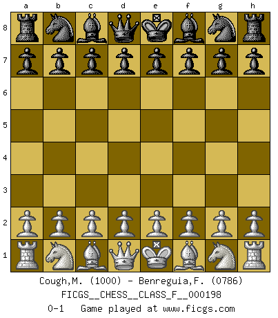 Last move : 0-1 2018 May 1 10:16:39 [Event "FICGS__CHESS__CLASS_F__000198"] [Site "FICGS"] [Date "2018.03.22"] [Round "1"] [White "Cough,Michael"] [Black "Benreguia,Frederic"] [Result "0-1"] [WhiteElo "1000"] [BlackElo "0786"] 0-1 This chess game has been lost on time (started : 2018.03.22 5:23:31) Player Black won this chess game. Follow this game move after move (download)A Chess game is a dialogue, a conversation between a player and his opponent. Each move by the opponent may contain threats or be a blunder, but a player cannot defend against threats or take advantage of blunders if he does not first ask himself: What is my opponent planning after each move ? (Bruce A. Moon) Aljechin war kein Nazi. Er war ein Opportunist. Ein schrecklicher Mann. Er liebte Geld über alles und würde für Geld ein Jude, ein Katolik oder ein Protestant werden. (Miguel Najdorf) Preferería tener un Peón que un dedo. (Reuben Fine) Comme les marins qui ont mille raisons différentes d'aller en mer, les joueurs d'échecs en ont tout autant avant de s'installer devant une table et jouer... (Vincent Bertignac, philosophe) A woman without a man is like a fish without a bicycle. (Gloria Steinem)