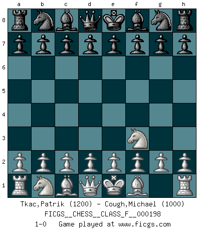 Last move : 1-0 2018 May 2 10:30:26 [Event "FICGS__CHESS__CLASS_F__000198"] [Site "FICGS"] [Date "2018.03.22"] [Round "1"] [White "Tkac,Patrik"] [Black "Cough,Michael"] [Result "1-0"] [WhiteElo "1200"] [BlackElo "1000"] 1.Nf3 1-0 This chess game has been lost on time (started : 2018.03.22 5:23:31) Reti Opening Player White won this chess game. Follow this game move after move (download)Fischer sacrificed virtually everything most of us weakies (to use his term) value, respect, and cherish, for the sake of an artful, often beautiful board game, for the ambivalent privilege of being its greatest master. (Paul Kollar) Der Bart als Geschlechtszeichen mitten im Gesicht ist obszön. Daher gefällt er den Weibern. [Zugegeben, kein Schachzitat, aber unglaublich originell] (Arthur Schopenhauer) El juego de Damas es para vagabundos. (Paul Morphy) J'apprécie les joueurs d'est-indienne, c'est grâce à eux que je nourris ma famille depuis tant d'années. (Petrosian) It is not titles that honor men, but men that honor titles. (Niccolo Machiavelli)