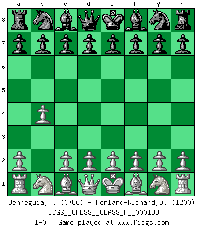 Last move : 1-0 2018 May 1 22:17:18 [Event "FICGS__CHESS__CLASS_F__000198"] [Site "FICGS"] [Date "2018.03.22"] [Round "1"] [White "Benreguia,Frederic"] [Black "Periard-Richard,David"] [Result "1-0"] [WhiteElo "0786"] [BlackElo "1200"] 1.b4 1-0 This chess game has been lost on time (started : 2018.03.22 5:23:31) Polish (Sokolsky) opening Player White won this chess game. Follow this game move after move (download)With or without the title, Bobby Fischer was unquestionably the greatest player of his time. (Burt Hochberg) Schach ist ein Reich, wo sich die menschliche Phantasie frei entfalten kann. (David Bronstein) El Ajedrez, como la música, como el amor, tiene el poder de hacer feliz a la gente. (Siegbert Tarrasch) La tactique, c'est ce que vous faites quand il y a quelque chose à faire; la stratégie, c'est ce que vous faites quand il n'y a rien à faire. (Savielli Tartacower) The smarter you play, the luckier you'll be. (Mark Pilarski)