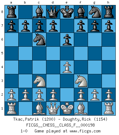 Last move : 1-0 2018 May 10 22:59:11 [Event "FICGS__CHESS__CLASS_F__000198"] [Site "FICGS"] [Date "2018.03.22"] [Round "1"] [White "Tkac,Patrik"] [Black "Doughty,Rick"] [Result "1-0"] [WhiteElo "1200"] [BlackElo "1154"] 1.Nc3 e6 2.Nf3 Nc6 3.e4 1-0 This chess game has been lost on time (started : 2018.03.22 5:23:31) Dunst (Sleipner, Heinrichsen) Opening Player White won this chess game. Follow this game move after move (download)If I win a tournament, I win it by myself. I do the playing. Nobody helps me. (Bobby Fischer) Wenn ich einen Club besuche, sind die Spieler stumm vor Staunen. (José Raúl Capablanca) Cuando tu no sabes absolutamente que mas hacer, es tiempo de entrar en pánico. (John van der Wiel) On a dit que l'homme se distingue de l'animal par le fait qu'il achète plus de livres qu'il ne peut en lire. Je voudrais suggérer qu'inclure à la liste des livres quelques livres d'échecs rendrait la distinction manifeste. (Edward Lasker) Children in the dark cause accidents, accidents in the dark cause children. (Unknown)