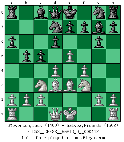 Last move : 1-0 2018 May 13 23:16:53 [Event "FICGS__CHESS__RAPID_D__000112"] [Site "FICGS"] [Date "2018.03.22"] [Round "1"] [White "Stevenson,Jack"] [Black "Galvez,Ricardo"] [Result "1-0"] [WhiteElo "1400"] [BlackElo "1502"] 1.e4 g6 2.d4 Bg7 3.Nc3 d6 4.f4 a6 5.Nf3 b5 6.Bd3 Nd7 7.e5 c5 8.Be3 1-0 This chess game has been lost on time (started : 2018.03.22 21:39:59) Robatsch defense : Pseudo-Austrian attack Player White won this chess game. Follow this game move after move (download)Not all artists are Chess players, but all Chess players are artists. (Marcel Duchamp) Sicherlich können nur Meister einen Stil haben. Daß ein nicht-Meister auch nur ein einziges Mal in seinem Leben eine Partie folgerecht durchführte, habe ich niemals bemerkt. (Emanuel Lasker) Un entendimiento minucioso de las típicas continuaciones de mate hacen de las mas complicadas combinaciones de sacrificio que conducen hacia ellas no solo no dificiles, sino casi un asunto de rutina. (Siegbert Tarrasch) On est toujours la mazette de quelqu'un d'autre. (Anonyme) Go and wake up your luck. (Persian saying)