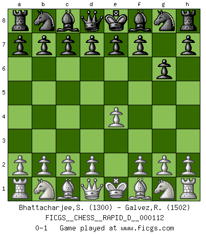 Last move : 0-1 2018 April 23 9:44:29 [Event "FICGS__CHESS__RAPID_D__000112"] [Site "FICGS"] [Date "2018.03.22"] [Round "1"] [White "Bhattacharjee,Somnath"] [Black "Galvez,Ricardo"] [Result "0-1"] [WhiteElo "1300"] [BlackElo "1502"] 1.e4 g6 0-1 This chess game has been lost on time (started : 2018.03.22 21:39:59) Robatsch (Modern) defense Player Black won this chess game. Follow this game move after move (download)Chess is a fairy tale of 1001 blunders. (Savielly Tartakower) Im Reiche der Wirklichkeit ist man nie so glücklich wie im Reiche der Gedanken. (Arthur Schopenhauer) ¿Se han dado cuenta de que Fischer casi nunca ha tenido piezas malas? El las intercambia y las piezas malas se quedan con sus oponenets. (Yuri Balashov) Votre seul travail dans les ouvertures est d'obtenir un milieu de partie jouable. (Lajos Portish) A cynic is a man who knows the price of everything but the value of nothing. (Oscar Wilde)