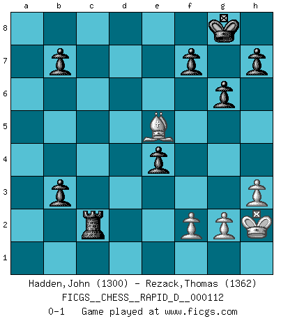 Last move : 0-1 2018 May 27 21:19:41 [Event "FICGS__CHESS__RAPID_D__000112"] [Site "FICGS"] [Date "2018.03.22"] [Round "1"] [White "Hadden,John"] [Black "Rezack,Thomas"] [Result "0-1"] [WhiteElo "1300"] [BlackElo "1362"] 1.d4 Nf6 2.Nf3 g6 3.Nc3 d5 4.e3 Bg7 5.Be2 O-O 6.Bd2 Nc6 7.a3 a6 8.O-O Qd6 9.b4 Bg4 10.h3 Bxf3 11.Bxf3 e5 12.dxe5 Nxe5 13.e4 Nxf3+ 14.Qxf3 dxe4 15.Qe2 Rfe8 16.Qe3 Nd5 17.Nxd5 Bxa1 18.Nxc7 Qxc7 19.Rxa1 Qxc2 20.Rc1 Qd3 21.Qh6 Rac8 22.Be3 Qxa3 23.Rxc8 Rxc8 24.Bd4 Qc1+ 25.Qxc1 Rxc1+ 26.Kh2 Rc4 27.Bc5 a5 28.Bd6 axb4 29.Kg3 Rc3+ 30.Kh2 b3 31.Be5 Rc2 0-1 King's Indian : East Indian defense Kingside Castling by player Black (move 5) Kingside Castling by player White (move 8) Player Black won this chess game. Follow this game move after move (download)Help your pieces so they can help you. (Paul Morphy) Es ist wirklich schade, dass so viele Schachspieler nicht auf ihr Äußeres achten! (Alexandra Kosteniuk) El Ajedrez es un regaderazo frío para la mente. (Sir John Simon) Des points faibles ou des trous dans la position de l'adversaire doivent être occupés par des pièces et non pas par des pions. (Siegbert Tarrasch) If computers get too powerful, we can organize them into committees. That'll do them in. (Anonymous)