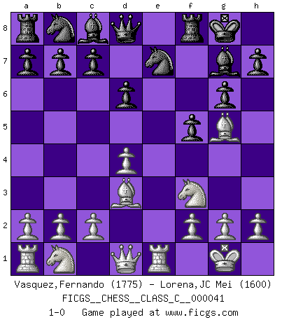 Last move : 1-0 2007 June 16 19:52:30 [Event "FICGS__CHESS__CLASS_C__000041"] [Site "FICGS"] [Date "2007.05.01"] [Round "1"] [White "Vasquez,Fernando"] [Black "Lorena,JC Mei"] [Result "1-0"] [WhiteElo "1775"] [BlackElo "1600"] 1.e4 g6 2.d4 e6 3.Bd3 Bg7 4.Be3 f5 5.exf5 exf5 6.Nf3 d6 7.O-O Ne7 8.Re1 O-O 9.Bg5 1-0 This chess game has been lost on time (started : 2007.05.01 6:0:0) Robatsch (Modern) defense Kingside Castling by player White (move 7) Kingside Castling by player Black (move 8) Player White won this chess game. Follow this game move after move (download)Life is a kind of Chess, with struggle, competition, good and ill events. (Benjamin Franklin) Strategie ist, wie man ein Mädchen auf den Rücksitz bekommt. Taktik ist, was man tut, wenn man dann dort ist. (Anonymous) Un buen jugador siempre tiene buena suerte. (José Raúl Capablanca) Je ne suis pas le dernier à jouer lâchement des coups douteux pendant le zeïtnot de l'adversaire pour l'achever: en effet les coups qui font le plus peur sont ceux que l'on ne comprend pas. Je me fais souvent peur quand je joue. (Un professeur anonyme) I couldn't make any sense out of what this particular thread is about. It sounds like R2 D2 computer speaking. A space fight ?!? Some 'command' problems in Moscow ? Some killers & narcotic addicts attacking some game & a god wannabe ?? (Dinesh De Silva, lost in a russian conflict in FICGS forum)