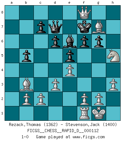 Last move : 1-0 2018 May 23 12:21:58 [Event "FICGS__CHESS__RAPID_D__000112"] [Site "FICGS"] [Date "2018.03.22"] [Round "1"] [White "Rezack,Thomas"] [Black "Stevenson,Jack"] [Result "1-0"] [WhiteElo "1362"] [BlackElo "1400"] 1.e4 e5 2.Nf3 Nc6 3.Bb5 a6 4.Ba4 Nf6 5.Nc3 b5 6.Bb3 Bc5 7.a3 d6 8.h3 h6 9.O-O O-O 10.d3 Nd4 11.Nxd4 Bxd4 12.Qf3 Bb7 13.Ne2 Bb6 14.Ng3 Bc8 15.a4 Bd7 16.axb5 axb5 17.Rxa8 Qxa8 18.Bxh6 Qd8 19.Bg5 Be6 20.Nh5 Ba5 21.Bxf6 Qd7 22.Qg3 g6 23.Qg5 Bd2 24.Qxd2 Kh7 25.Bg7 f6 26.Qh6+ Kg8 27.Qh8+ Kf7 28.Qxf8+ 1-0 Ruy Lopez : Four knights (Tarrasch) variation Kingside Castling by player White (move 9) Kingside Castling by player Black (move 9) Player White won this chess game. Follow this game move after move (download)I prefer to lose a really good game than to win a bad one. (David Levy) Die Auseinandersetzung mit Karpow war politisch geprägt. Er stand für das kommunistische System, wurde von dessen Repräsentanten gehätschelt. Ich war der Oppositionelle. Jeder Schachweltmeister spiegelt auch die gesellschaftlichen Verhältnisse wider. Kramnik steht für die Börsen-Generation des Neuen Markts, ideologiefrei, zahlenfixiert. (Garry Kasparov) Cuando estes solo, cuando te sientas un extraño en el mundo, juega al Ajedrez. Esto levantará tu espiritu y será tu consejero de guerra. (Aristóteles) Les Echecs sont et restent toujours un combat, un combat intégral comme la boxe, la lutte ou un autre sport, et où il doit y avoir un vainqueur et un vaincu. (Joseph Emil Diemer) Inventor: A person who makes an ingenious arrangement of wheels, levers and springs, and believes it civilization. (Ambrose Bierce, The Devil's Dictionary)