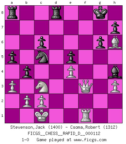 Last move : 1-0 2018 May 7 23:34:48 [Event "FICGS__CHESS__RAPID_D__000112"] [Site "FICGS"] [Date "2018.03.22"] [Round "1"] [White "Stevenson,Jack"] [Black "Csoma,Robert"] [Result "1-0"] [WhiteElo "1400"] [BlackElo "1312"] 1.e4 d6 2.d4 Nf6 3.Nc3 g6 4.f4 Bg7 5.Nf3 O-O 6.Bd3 Bg4 7.h3 Bxf3 8.Qxf3 c6 9.Be3 Nfd7 10.O-O-O e5 11.dxe5 dxe5 12.f5 Qe7 13.g4 Nf6 14.g5 Ne8 15.f6 Nxf6 16.gxf6 Bxf6 17.Qf2 b6 18.Rdg1 Bh4 19.Qg2 Nd7 20.Bh6 Rfd8 21.a3 Nc5 22.Bc4 b5 23.Ba2 a5 24.Rf1 b4 25.Rxf7 Qxf7 26.Bxf7+ Kxf7 27.Rf1+ Kg8 28.Qf3 1-0 Pirc : Austrian attack, 6.Bd3 Kingside Castling by player Black (move 5) Queenside Castling by player White (move 10) Player White won this chess game. Follow this game move after move (download)The winner of the game is the player who makes the next-to-last mistake. (Savielly Tartakover) Ich las kürzlich ein Buch von Nietzsche. Er sagte Religion verdumme nur die Menschen. Ich stimme zu. (Robert James Fischer) Nos gusta pensar. (Gary Kasparov) Les Cavaliers se révèlent fort utiles dans les positions fermées. D'habitude, les Fous sont un peu plus forts que les Cavaliers dans les positions ouvertes. Qu'on le veuille ou non, il restera toujours des exceptions ! There is a great deal of difference between an eager man who wants to read a book and a tired man who wants a book to read. (G.K. Chesterton)