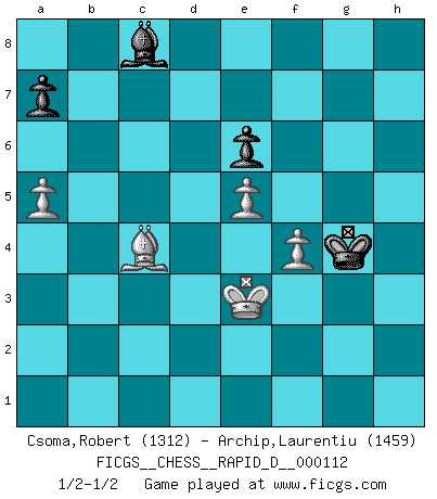 Last move : 1/2-1/2 2018 May 2 21:46:44 [Event "FICGS__CHESS__RAPID_D__000112"] [Site "FICGS"] [Date "2018.03.22"] [Round "1"] [White "Csoma,Robert"] [Black "Archip,Laurentiu"] [Result "1/2-1/2"] [WhiteElo "1312"] [BlackElo "1459"] 1.Nf3 Nf6 2.d4 d5 3.c4 dxc4 4.Qa4+ c6 5.Qxc4 e6 6.Nc3 Be7 7.e4 O-O 8.Bd3 b6 9.Qb3 Bb7 10.O-O c5 11.Be3 cxd4 12.Bxd4 Nc6 13.Bxf6 Bxf6 14.Rfd1 Qc7 15.Rac1 Ne5 16.Nxe5 Qxe5 17.Re1 Rfd8 18.Bf1 Rd4 19.Rcd1 Rad8 20.Rxd4 Rxd4 21.f3 Qc5 22.Kh1 Qh5 23.Ne2 Rd8 24.Ng3 Qh4 25.e5 Bg5 26.Qc2 Bf4 27.Qf2 Bxg3 28.Qxg3 Qxg3 29.hxg3 g6 30.Kg1 Rd2 31.Re2 Rd1 32.Kf2 Ba6 33.Re1 Rxe1 34.Kxe1 Bb7 35.Kd2 h5 36.Ke3 Kg7 37.Kd4 f6 38.Bc4 Kf7 39.a3 f5 40.b3 g5 41.Bd3 g4 42.Be2 gxf3 43.gxf3 f4 44.gxf4 h4 45.Ke3 h3 46.Kf2 Kg6 47.Bd3+ Kh5 48.Kg3 h2 49.Kxh2 Bxf3 50.Kg3 Bc6 51.Bc4 Bd7 52.Kf3 Kg6 53.Ke3 Kf5 54.Bd3+ Kg4 55.b4 Bc8 56.a4 Bd7 57.a5 bxa5 58.bxa5 Bc8 59.Bc4 1/2-1/2 Reti Opening Kingside Castling by player Black (move 7) Kingside Castling by player White (move 10) 10 pieces endgame at move 57 : White KBPPP , Black KBPPP WHITE : King + 1 Bishop 3 Pawns BLACK : King + 1 Bishop 3 Pawns 9 pieces endgame at move 58 : White KBPPP , Black KBPP WHITE : King + 1 Bishop 3 Pawns BLACK : King + 1 Bishop 2 Pawns This chess game ended in a draw. Follow this game move after move (download)There's never before been a Chess player with such a thorough knowledge of the intricacies of the game and such an absolutely indomitable will to win. I think Bobby is the greatest player that ever lived. (Lisa Lane) Ich habe Kasparov in Rente geschickt. (Veselin Topalov) Dios mío, Bobby Fischer juega tan simple. (Alexei Suetin) Je ne crois pas en la psychologie, je crois aux bons coups. (Robert Fischer) He who is a good ruler must first have been ruled. (Aristotle)