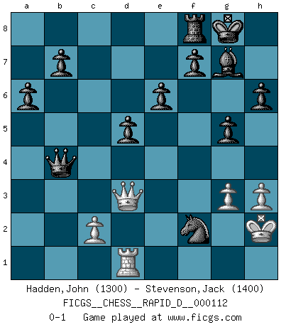 Last move : 0-1 2018 May 9 1:54:53 [Event "FICGS__CHESS__RAPID_D__000112"] [Site "FICGS"] [Date "2018.03.22"] [Round "1"] [White "Hadden,John"] [Black "Stevenson,Jack"] [Result "0-1"] [WhiteElo "1300"] [BlackElo "1400"] 1.d4 Nf6 2.Nc3 d5 3.Nf3 g6 4.Bg5 Bg7 5.e3 O-O 6.Bd3 c5 7.O-O cxd4 8.exd4 Nc6 9.a3 Bg4 10.h3 Bxf3 11.Qxf3 Nxd4 12.Qd1 a6 13.Be2 Nxe2+ 14.Qxe2 Rc8 15.Rad1 e6 16.Qf3 h6 17.Bh4 g5 18.Bg3 Qb6 19.b4 Nd7 20.Rd2 Rxc3 21.Qh5 Rxg3 22.Kh2 Rxa3 23.g3 Qxb4 24.Rfd1 Nf6 25.Qe2 Ne4 26.Rd3 Rxd3 27.Qxd3 Nxf2 0-1 Queen's pawn game Kingside Castling by player Black (move 5) Kingside Castling by player White (move 7) Player Black won this chess game. Follow this game move after move (download)Chess is in its essence a game, in its form an art, and in its execution a science. (Baron Tassilo) Zum Sieg gelangt man nicht, wenn man gut, sondern nur wenn man besser spielt (Savielly Grigorievitsch Tartakower) Aquel que ve no otra dirección en el juego que la de dar Jaque Mate a su oponente, nunca será un buen jugador de Ajedrez. (Euwe) On croit qu'il y a plus de mauvais joueurs que de bons joueurs, c'est faux : Il y a autant de joueurs qui gagnent que de joueurs qui perdent. (Philippe Geluck) When you stop learning you start dying. (Scott Adams)