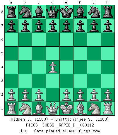 Last move : 1-0 2018 May 12 11:13:51 [Event "FICGS__CHESS__RAPID_D__000112"] [Site "FICGS"] [Date "2018.03.22"] [Round "1"] [White "Hadden,John"] [Black "Bhattacharjee,Somnath"] [Result "1-0"] [WhiteElo "1300"] [BlackElo "1300"] 1.d4 1-0 This chess game has been lost on time (started : 2018.03.22 21:39:59) Queen's pawn Player White won this chess game. Follow this game move after move (download)The passed Pawn is a criminal, who should be kept under lock and key. Mild measures, such as police surveillance, are not sufficient. (Aaron Nimzovich) Pläne sind die Träume des Verständigen. (Ernst Freiherr von Feuchtersleben) En la perfecta combinación de Ajedrez como en una historia corta de primera clase, toda la trama y contra trama deberá conducir hacia un final sorprendente, el interes no es mitigado hasta el último momento. (Yates and Winter) Il vaut mieux sacrifier les pièces de l'adversaire. (Xavier Tartacover) May I never be complete. May I never be content. May I never be perfect. Deliver me, Tyler, from being perfect and complete. (Chuck Palahniuk, Fight Club)