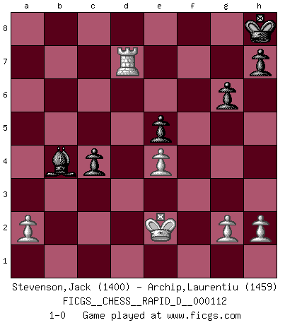 Last move : 1-0 2018 April 30 6:28:27 [Event "FICGS__CHESS__RAPID_D__000112"] [Site "FICGS"] [Date "2018.03.22"] [Round "1"] [White "Stevenson,Jack"] [Black "Archip,Laurentiu"] [Result "1-0"] [WhiteElo "1400"] [BlackElo "1459"] 1.e4 c5 2.Nf3 Nc6 3.d4 cxd4 4.Nxd4 g6 5.c4 Bg7 6.Be3 e5 7.Nxc6 bxc6 8.c5 Ne7 9.Nc3 O-O 10.Bc4 Kh8 11.Qd2 f5 12.f3 a5 13.O-O Ba6 14.Bxa6 Rxa6 15.Rad1 Ra7 16.Na4 Nc8 17.b3 Qe7 18.Nb6 Rd8 19.Nc4 a4 20.b4 d5 21.cxd6 Nxd6 22.Nxd6 Rad7 23.Bc5 Bf8 24.Qc2 Rxd6 25.Rxd6 Rxd6 26.Qxa4 Qd7 27.Bxd6 Qxd6 28.Rd1 Qxb4 29.Qxb4 Bxb4 30.Rd7 fxe4 31.fxe4 c5 32.Kf1 c4 33.Ke2 1-0 Sicilian : Accelerated Fianchetto, Maroczy bind, 6.Be3 Kingside Castling by player Black (move 9) Kingside Castling by player White (move 13) Player White won this chess game. Follow this game move after move (download)The defensive power of a pinned piece is only imaginary. (Aaron Nimzovich) Je mehr wir mit Computern analysieren, desto mehr glauben wir an Verteidigung. (Vladimir Kramnik) Los problemas de Ajedrez exigen del compositor las mismas virtudes que caracterizan todo el arte de valor: originalidad, invención, concisión, armonía, complejidad e insinceridad explendida. (Vladimir Nabokov) Plusieurs personnes se sont demandées comment Tal faisait pour gagner... En fait, c'est très simple ! Il met ses pièces au centre de l'échiquier et les sacrifie quelque part ! (David Bronstein) They say in chess you've got to kill the queen, and then you mate it... Oh I, do you ? (Red Hot Chili Peppers, Fortune faded)