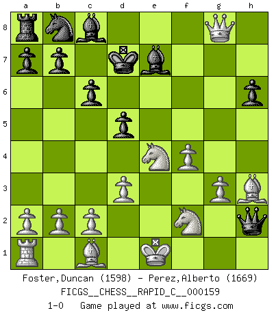 Last move : 1-0 2018 May 11 0:49:40 [Event "FICGS__CHESS__RAPID_C__000159"] [Site "FICGS"] [Date "2018.03.22"] [Round "1"] [White "Foster,Duncan"] [Black "Perez,Alberto"] [Result "1-0"] [WhiteElo "1598"] [BlackElo "1669"] 1.e4 e5 2.f4 f5 3.exf5 e4 4.Qh5+ g6 5.fxg6 Nf6 6.g7 Nxh5 7.gxh8Q Qh4 8.g3 Nxg3 9.hxg3 Qxh1 10.Qe5+ Kd8 11.Nh3 h6 12.Qf6+ Ke8 13.Qg6+ Kd8 14.Nf2 Qh2 15.Nc3 c6 16.Ncxe4 Be7 17.d3 d5 18.Qg8+ Kd7 19.Bh3+ 1-0 King's gambit Promotion Queen by player White (move 7) Player White won this chess game. Follow this game move after move (download)Human affairs are like a Chess game: only those who do not take it seriously can be called good players. (Hung Tzu Ch'eng) Kombinieren und Schwarzhandel gehören verboten. (Savielly Grigorievitsch Tartakower) ¡Examina movidas que hagan daño! Un buen ojo for movidas desvastantes es mucho mas importante que el conocimiento de principios estratégicos. (Purdy) La tactique est l'élément le plus important du milieu de jeu. (Siegbert Tarrasch) Kids, you tried your best and you failed miserably. The lesson is, never try. (Simpsons)