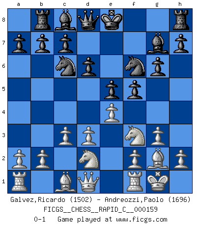 Last move : 0-1 2018 May 8 10:45:34 [Event "FICGS__CHESS__RAPID_C__000159"] [Site "FICGS"] [Date "2018.03.22"] [Round "1"] [White "Galvez,Ricardo"] [Black "Andreozzi,Paolo"] [Result "0-1"] [WhiteElo "1502"] [BlackElo "1696"] 1.Nf3 Nc6 2.e4 d6 3.d3 e5 4.Nbd2 f5 5.g3 Nf6 6.Bg2 g6 7.O-O Bg7 8.c3 Rb8 0-1 This chess game has been lost on time (started : 2018.03.22 21:40:45) Reti Opening Kingside Castling by player White (move 7) Player Black won this chess game. Follow this game move after move (download)I'm not a materialistic person, in that, I don't suffer the lack or loss of money. The absence of worldly goods I don't look back on. For Chess is a way I can be as materialistic as I want without having to sell my soul. (Jamie Walter Adams) Wenn ich einen Club besuche, sind die Spieler stumm vor Staunen. (José Raúl Capablanca) Nos gusta pensar. (Gary Kasparov) Ce qui est bien, c'est d'avoir tout un tas de pièces en prise : l'adversaire ne peut en prendre qu'une à la fois. Cité par Thierry Audin. Hello Thibault, if I have had a plan (and I had one, I hope), I have forgotten it during the last week... - Hello Heinz-Georg. What do you mean a plan ? (Anonymous players, during a Big Chess game)