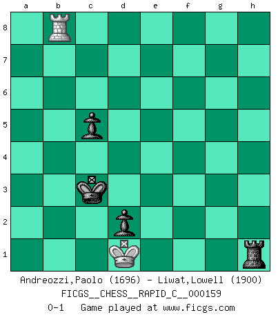 Last move : 0-1 2018 May 2 17:30:37 [Event "FICGS__CHESS__RAPID_C__000159"] [Site "FICGS"] [Date "2018.03.22"] [Round "1"] [White "Andreozzi,Paolo"] [Black "Liwat,Lowell"] [Result "0-1"] [WhiteElo "1696"] [BlackElo "1900"] 1.d4 d5 2.c4 c6 3.Nc3 dxc4 4.a4 e5 5.e3 Bb4 6.Bxc4 exd4 7.Qxd4 Qxd4 8.exd4 Nf6 9.Nge2 Be6 10.Bxe6 fxe6 11.O-O h6 12.Nf4 Kf7 13.Re1 Re8 14.Re3 Bxc3 15.bxc3 Nbd7 16.Ba3 Nd5 17.Rf3 N7f6 18.Bd6 g5 19.Nxd5 exd5 20.Be5 Re6 21.Rb1 b6 22.a5 b5 23.h3 h5 24.g4 hxg4 25.hxg4 Rae8 26.Bxf6 Rxf6 27.Kg2 Re2 28.Rh1 Rxf3 29.Kxf3 Rc2 30.Rh7+ Ke6 31.Rxa7 Rxc3+ 32.Ke2 Ra3 33.a6 b4 34.f4 gxf4 35.Rb7 Rxa6 36.Rxb4 Ra3 37.Rb6 Kd6 38.Rb8 Rg3 39.Rg8 Kc7 40.g5 Kb6 41.g6 Kb5 42.g7 Kc4 43.Rf8 Rxg7 44.Rxf4 Re7+ 45.Kd2 Re4 46.Rf6 Rxd4+ 47.Kc2 c5 48.Ra6 Kb5 49.Ra8 Rh4 50.Kc3 d4+ 51.Kc2 Kb4 52.Rb8+ Kc4 53.Ra8 d3+ 54.Kd2 Rh2+ 55.Kd1 Kb3 56.Rb8+ Kc3 57.Ke1 d2+ 58.Kd1 Rh1+ 0-1 QGD Slav defense Kingside Castling by player White (move 11) 10 pieces endgame at move 35 : White KRPP , Black KRPPPP WHITE : King + 1 Rook 2 Pawns BLACK : King + 1 Rook 4 Pawns 9 pieces endgame at move 36 : White KRPP , Black KRPPP WHITE : King + 1 Rook 2 Pawns BLACK : King + 1 Rook 3 Pawns 8 pieces endgame at move 43 : White KRP , Black KRPPP WHITE : King + 1 Rook 1 Pawn BLACK : King + 1 Rook 3 Pawns 7 pieces endgame at move 44 : White KRP , Black KRPP WHITE : King + 1 Rook 1 Pawn BLACK : King + 1 Rook 2 Pawns 6 pieces endgame at move 46 : White KR , Black KRPP WHITE : King + 1 Rook BLACK : King + 1 Rook 2 Pawns Player Black won this chess game. Follow this game move after move (download)I know people who have all the will in the world, but still can't play good Chess. (Bobby Fischer) Ich war zu klein für die Schach-Schülermannschaft! (Woody Allen) No soy una persona materialista y por eso, no resiento la falta o pérdida del dinero. La ausencia de cosas mundanas carece de importancia. Ya que el Ajedrez es una forma en la que puedo ser tan materialista como yo desee sin tener la necesidad de vender mi alma. (Jamie Walter Adams) Toutes choses étant égales, c'est la conviction qui gagne. Alliée à une volonté de vaincre, elle sert de détonateur, suscite des idées, disperse les doutes et aide à penser clairement. (Robert Fischer) Nowadays, anyone who cannot speak English and is incapable of using the Internet is regarded as backward. (Al-Waleed bin Talal)