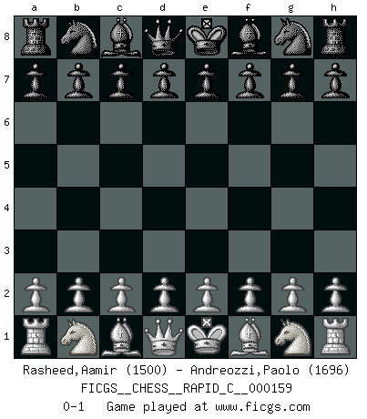 Last move : 0-1 2018 April 22 9:35:59 [Event "FICGS__CHESS__RAPID_C__000159"] [Site "FICGS"] [Date "2018.03.22"] [Round "1"] [White "Rasheed,Aamir"] [Black "Andreozzi,Paolo"] [Result "0-1"] [WhiteElo "1500"] [BlackElo "1696"] 0-1 This chess game has been lost on time (started : 2018.03.22 21:40:45) Player Black won this chess game. Follow this game move after move (download)I guess a certain amount of temperament is expected of Chess geniuses. (Ron Gross) Gewöhnliche Menschen denken nur daran, wie sie ihre Zeit verbringen. Ein intelligenter Mensch versucht, sie auszunutzen. (Arthur Schopenhauer) Siempre es mejor sacrificar los hombres de tu oponente. (Savielly Tartakower) Je menace de comprendre la position. (Anonyme) Life is the sum of all your choices. (Albert Camus)