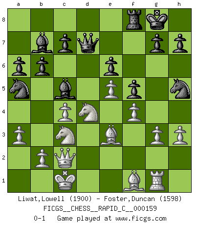 Last move : 0-1 2018 April 24 0:21:49 [Event "FICGS__CHESS__RAPID_C__000159"] [Site "FICGS"] [Date "2018.03.22"] [Round "1"] [White "Liwat,Lowell"] [Black "Foster,Duncan"] [Result "0-1"] [WhiteElo "1900"] [BlackElo "1598"] 1.c4 f5 2.d4 Nf6 3.Nc3 e6 4.f3 Nc6 5.e4 Bb4 6.e5 Nh5 7.Be3 O-O 8.Nge2 d6 9.f4 dxe5 10.dxe5 a6 11.Qc2 Be7 12.Rd1 Qe8 13.a3 b6 14.g3 Bb7 15.Rg1 Rd8 16.h3 Rxd1+ 17.Kxd1 Na5 18.Nd4 Qd7 19.Kc1 Bc5 0-1 English : Anglo-Dutch defense Kingside Castling by player Black (move 7) Player Black won this chess game. Follow this game move after move (download)After black's reply to 1.e4 with 1..e5, leaves him always trying to get into the game. (Howard Staunton) Gott hat gewollt, dass ich Champion werde. (Surab Azmajparaschvili) Nunca nadie ha ganado una partida de Ajedrez rindiendose. (Unknown) La menace est plus forte que l'exécution. (Aaron Nimzovitch) There are two major products that came out of Berkeley: LSD and UNIX. We do not believe this is to be a coincidence. (Jeremy S. Anderson)