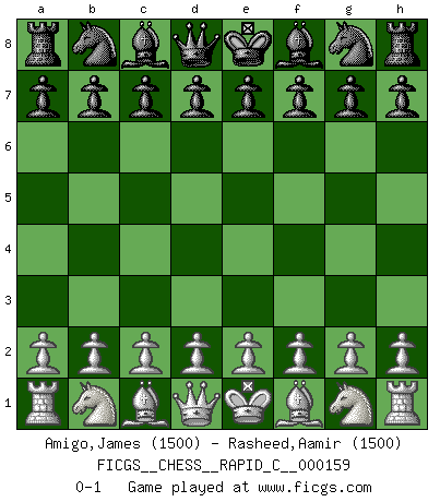 Last move : 0-1 2018 April 22 9:35:59 [Event "FICGS__CHESS__RAPID_C__000159"] [Site "FICGS"] [Date "2018.03.22"] [Round "1"] [White "Amigo,James"] [Black "Rasheed,Aamir"] [Result "0-1"] [WhiteElo "1500"] [BlackElo "1500"] 0-1 This chess game has been lost on time (started : 2018.03.22 21:40:45) Player Black won this chess game. Follow this game move after move (download)First-class players lose to second class players because second-class players sometimes play a first-class game. (Tarrasch) Wenn man heute mit 14 Jahren noch kein GM ist, kann man es vergessen. (Viswanathan Anand) No existe un remordimiento como el remordimiento del Ajedrez. (H. G. Wells) Nous vivons dans un monde échiquéen : chaque jour qui passe est un défi à relever. (Philosophe Sasha) I find your interest interesting. (Gregory House, House M.D.)