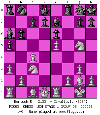 Last move : 1-0 2018 April 17 18:16:35 [Event "FICGS__CHESS__WCH_STAGE_1_GROUP_08__000019"] [Site "FICGS"] [Date "2018.03.23"] [Round "1"] [White "Bartsch,Reinhard Andrea"] [Black "Cirulis,Ilmars"] [Result "1-0"] [WhiteElo "2133"] [BlackElo "2037"] 1.c4 e6 2.Nc3 f5 3.g3 Nf6 4.Nf3 b6 5.Bg2 Bb7 6.d3 Be7 7.O-O O-O 8.Re1 a5 9.e4 fxe4 10.dxe4 Kh8 11.e5 Ng8 12.a3 Ba6 13.Ng5 1-0 English Opening Kingside Castling by player White (move 7) Kingside Castling by player Black (move 7) Player White won this chess game. Follow this game move after move (download)The essence of Chess is thinking about what Chess is. (David Bronstein) Besser ein falscher Plan, logisch durchgeführt, als gar kein Plan. (Viktor Kortschnoi) El arma más poderosa en el Ajedrez, es tener la próxima movida. (David Bronstein) Avant la finale, les dieux ont créé le milieu de partie. (Tarrasch) Heh, heh, heh. Time to abandon ship. (General Grievous in Star Wars ep.3)