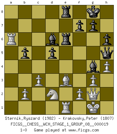 Last move : 1-0 2018 June 13 2:44:42 [Event "FICGS__CHESS__WCH_STAGE_1_GROUP_08__000019"] [Site "FICGS"] [Date "2018.03.23"] [Round "1"] [White "Sternik,Ryszard"] [Black "Krakovsky,Peter"] [Result "1-0"] [WhiteElo "1982"] [BlackElo "1807"] 1.e4 e5 2.Nf3 Nc6 3.Bb5 a6 4.Ba4 Nf6 5.O-O Be7 6.Re1 b5 7.Bb3 O-O 8.c3 d5 9.exd5 Nxd5 10.Nxe5 Nxe5 11.Rxe5 c6 12.d4 Bd6 13.Re1 Qh4 14.g3 Qh3 15.Be3 Bg4 16.Qd3 Rae8 17.Nd2 Re6 18.a4 Qh5 19.axb5 axb5 20.Bxd5 Qxd5 21.Qf1 Rfe8 22.Qg2 Qh5 23.Kh1 Bf8 24.Kg1 h6 25.h4 Bd6 26.d5 cxd5 27.Ra6 1-0 This chess game has been lost on time (started : 2018.03.23 18:24:53) Ruy Lopez : Closed, 7...O-O Kingside Castling by player White (move 5) Kingside Castling by player Black (move 7) Player White won this chess game. Follow this game move after move (download)I give 98 percent of my mental energy to Chess. Others give only 2 percent. (Bobby Fischer) Schach ist wie eine schöne Frau, zu der wir ständig zurückkehren, gleichviel, wie oft sie uns zurückweist. (Anonymous) La única cosa que los jugadores de Ajedrez tienen en común, es el Ajedrez. (Lodewijk Prins) Mais n'est-ce pas déjà le limiter injurieusement que d'appeler les échecs un jeu? N'est-ce pas aussi une science, un art, ou quelque chose qui, comme le cercueil de Mahomet entre ciel et terre, est suspendu entre l'un et l'autre, et qui réunit un nombre incroyable de contraires ? (Stefan Zweig) To err is human, but to really foul things up requires a computer. (Farmer's Almanac, 1978)
