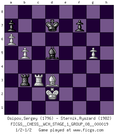 Last move : 1/2-1/2 2018 May 24 18:11:20 [Event "FICGS__CHESS__WCH_STAGE_1_GROUP_08__000019"] [Site "FICGS"] [Date "2018.03.23"] [Round "1"] [White "Osipov,Sergey"] [Black "Sternik,Ryszard"] [Result "1/2-1/2"] [WhiteElo "1796"] [BlackElo "1982"] 1.d4 Nf6 2.Bg5 Ne4 3.Bf4 c5 4.f3 Qa5+ 5.c3 Nf6 6.d5 Qb6 7.b3 e6 8.e4 exd5 9.exd5 Bd6 10.Bxd6 Qxd6 11.c4 O-O 12.Nc3 Re8+ 13.Nge2 Qe5 14.Qc1 d6 15.Kf2 Nbd7 16.Qd2 b5 17.cxb5 Bb7 18.Qf4 Nb6 19.Qxe5 Rxe5 20.Nf4 Rae8 21.Nd3 Re3 22.Rc1 Nbxd5 23.Nxd5 Nxd5 24.h4 g6 25.Nb2 Nf4 26.Nc4 R3e6 27.Rc2 Ba8 28.Rd2 d5 29.Nb2 R6e7 30.Bd3 Kg7 31.Rc1 Ne6 32.Bf1 h6 33.a4 Kf6 34.Rb1 g5 35.hxg5+ hxg5 36.a5 g4 37.fxg4 Rg8 38.Na4 Rxg4 39.Rc1 Rc7 40.Rdc2 Rf4+ 41.Kg1 Nd4 42.Rxc5 Re7 43.Rb1 Nxb3 44.Rxb3 Rxa4 45.Rf3+ Ke6 46.Re3+ Re4 47.Rg3 Kd7 48.Bd3 Kd6 49.Rc8 Bb7 50.Rd8+ Kc7 51.Rf8 Re1+ 52.Kh2 d4 53.Rg4 R1e5 54.Rxd4 Rd5 55.Rc4+ Kd6 56.Rc3 Rh5+ 57.Kg3 Bd5 58.Rd8+ Rd7 59.Rxd7+ Kxd7 60.Kf2 Rh2 61.Bf1 Rh4 62.g4 Rh2+ 63.Ke3 Rb2 64.Be2 Rb4 65.g5 Kd6 66.a6 Re4+ 67.Kf2 Rb4 68.Rc8 Kd7 69.Rc2 Kd6 70.Rc3 Rb2 71.Ke3 Rb4 72.Kd2 Rb2+ 73.Rc2 Rb1 74.Rc8 Rb2+ 75.Ke3 Rb3+ 76.Kf2 Rb2 77.Kf1 Rb1+ 78.Kf2 Rb2 79.Ke3 Rb3+ 80.Bd3 Kd7 81.Rc2 Kd6 82.Kd2 Kd7 83.Rc3 1/2-1/2 Trompowsky attack (Ruth, Opovcensky Opening) Kingside Castling by player Black (move 11) This chess game ended in a draw. Follow this game move after move (download)White lost because he failed to remember the right continuation and had to think up the moves himself. (Siegbert Tarrasch) Wer der Ansicht ist, daß alle Schachspieler verrückt sind, wird durch Studium des Lebens von Emil Josef Diemer nicht auf andere Gedanken kommen. (Hans Ree) Un buen sacrificio es aquel que aunque no sea necesariamente sólido, deja a tu oponente aturdido y confuso. (Rudolph Spielmann) Echiquier : carré parfait, comme la Jérusalem nouvelle décrite par l'auteur de l'Apocalypse, huit cases sur huit, exaltation du chiffre 4, symbole du cosmos aux quatre horizons... où le noir et le blanc, l'ombre et la lumière, le mal et le bien s'entremêlent et se conjuguent. (Robert Couffignal, Le Gambit du poète) Question: Is 'This statement is paradoxical' a paradoxical statement ? Or is it a meta-paradox ? (Normajean Yates)