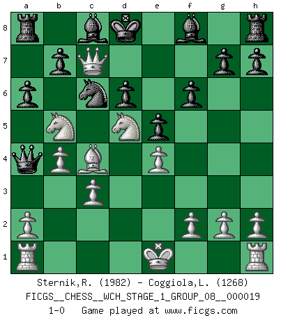 Last move : 1-0 2018 April 5 18:23:18 [Event "FICGS__CHESS__WCH_STAGE_1_GROUP_08__000019"] [Site "FICGS"] [Date "2018.03.23"] [Round "1"] [White "Sternik,Ryszard"] [Black "Coggiola,Leandro Damian"] [Result "1-0"] [WhiteElo "1982"] [BlackElo "1268"] 1.e4 c5 2.Nf3 d6 3.d4 cxd4 4.Nxd4 Nc6 5.Nc3 Nf6 6.Bg5 e5 7.Bxf6 Qxf6 8.Ndb5 Qd8 9.Nd5 Qa5+ 10.c3 Kd7 11.Qh5 f6 12.Bc4 a6 13.Qf7+ Kd8 14.b4 Qa4 15.Qc7+ 1-0 Sicilian Player White won this chess game. Follow this game move after move (download)War is the child of passion, passion is the child of narcissism and narcissism is the child. (...) Another game ? (Thibault de Vassal) Ich war zu klein für die Schach-Schülermannschaft! (Woody Allen) Haz el enroque temprano y seguido. (Rob Sillars) La guerre est enfant de la passion, la passion est enfant du narcissisme et le narcissisme est l'enfant. (...) Une autre partie ? (Thibault de Vassal) There is no vagueness without wind. (Chinese proverb)