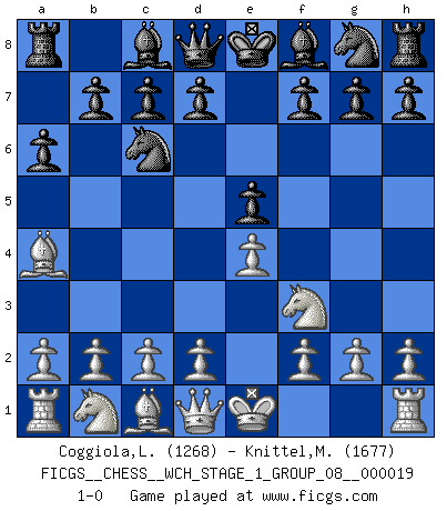 Last move : 1-0 2018 April 26 9:59:21 [Event "FICGS__CHESS__WCH_STAGE_1_GROUP_08__000019"] [Site "FICGS"] [Date "2018.03.23"] [Round "1"] [White "Coggiola,Leandro Damian"] [Black "Knittel,Martin"] [Result "1-0"] [WhiteElo "1268"] [BlackElo "1677"] 1.e4 e5 2.Nf3 Nc6 3.Bb5 a6 4.Ba4 1-0 This chess game has been lost on time (started : 2018.03.23 18:24:53) Ruy Lopez Player White won this chess game. Follow this game move after move (download)Chess is life. (Bobby Fischer) Glücklicherweise sind Großmeister Ruben Fines reine Schachbücher weniger phallozentrisch [als seine Schachpsychologie] und deswegen auch weniger lächerlich. (Nigel Short) Si yo gano un torneo, yo lo gano por mí mismo. Yo hago las jugadas. Nadie me ayuda. (Bobby Fischer) Karpov est une pièce de musée. (Garry Kasparov) Always two there are. No more no less. A master, and an apprentice. (Master Yoda in Star Wars ep.1)