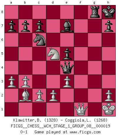 Last move : 0-1 2018 March 30 0:55:17 [Event "FICGS__CHESS__WCH_STAGE_1_GROUP_08__000019"] [Site "FICGS"] [Date "2018.03.23"] [Round "1"] [White "Klawitter,Bernd"] [Black "Coggiola,Leandro Damian"] [Result "0-1"] [WhiteElo "1328"] [BlackElo "1268"] 1.b3 e5 2.Bb2 Nc6 3.e3 Nf6 4.a3 Be7 5.Be2 O-O 6.Nh3 d6 7.O-O Bxh3 8.gxh3 d5 9.Kh1 Qd7 10.Bg4 Nxg4 11.hxg4 f5 12.Rg1 fxg4 13.Rxg4 Rxf2 14.Qg1 Rf7 15.Nc3 Raf8 16.Rf1 Rxf1 17.Rxg7+ Kh8 18.Rg8+ Rxg8 19.Qxf1 Qg4 20.Nxd5 Qe4+ 0-1 Nimzovich-Larsen attack : Modern variation Kingside Castling by player Black (move 5) Kingside Castling by player White (move 7) Player Black won this chess game. Follow this game move after move (download)I thought the most common mistake [in chess] was the first one: Learning the game :P (Garvin Gray, FICGS forum) Ein typischer, sehr verbreiteter Gedankenschädling ist der, daß der betreffende Amateur von der Annanhme ausgeht, daß jeder einzelne Zug etwas zu leisten habe. (Aaron Nimzowitsch) El ganador de una partida es aquel jugador que hace el penúltimo error. (Savielly Tartakover) Aucun coup ne doit être joué sans but. (Pedro Damiano) A cynic is a man who knows the price of everything but the value of nothing. (Oscar Wilde)