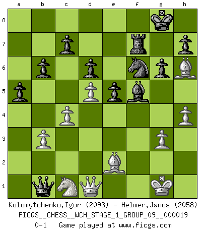 Last move : 0-1 2018 July 10 7:10:30 [Event "FICGS__CHESS__WCH_STAGE_1_GROUP_09__000019"] [Site "FICGS"] [Date "2018.03.23"] [Round "1"] [White "Kolomytchenko,Igor"] [Black "Helmer,Janos"] [Result "0-1"] [WhiteElo "2093"] [BlackElo "2058"] 1.d4 Nf6 2.c4 g6 3.Nc3 Bg7 4.e4 d6 5.Nf3 O-O 6.Be2 e5 7.d5 a5 8.O-O Na6 9.b3 Nc5 10.Qc2 Nh5 11.Re1 Nf4 12.Bf1 f5 13.Nd2 Bd7 14.Re3 Nh5 15.Nf3 fxe4 16.Nd2 Bh6 17.Re1 Rxf2 18.Kxf2 Qh4+ 19.Kg1 Qxe1 20.Ndxe4 Nxe4 21.Nxe4 Rf8 22.Qe2 Be3+ 23.Bxe3 Qxa1 24.Nf2 Nf4 25.Qd1 Qxa2 26.g3 Nh5 27.Be2 Bf5 28.Nd3 Nf6 29.Nc1 Qb1 30.h4 b6 31.Bh6 Rf7 0-1 This chess game has been lost on time (started : 2018.03.23 18:24:49) King's Indian : Petrosian system, Stein variation Kingside Castling by player Black (move 5) Kingside Castling by player White (move 8) Player Black won this chess game. Follow this game move after move (download)It's just you and your opponent at the board and you're trying to prove something. (Bobby Fischer) Heutzutage gewinnt im Turnier nicht derjenige Spieler, der weitreichende Pläne entwirft, sondern einfach jener, der Zug um Zug kämpft. (David Bronstein) Yo no le temo a Spassky. Todos saben que yo soy el mejor. Uno no necesita un torneo para probarlo. (Bobby Fischer) Même si vous avez un bon coup à faire, regardez toujours s'il n'y en a pas un qui lui soit préférable. (Pedro Damiano) The best teachers teach from the heart, not from the book. (Author unknown)