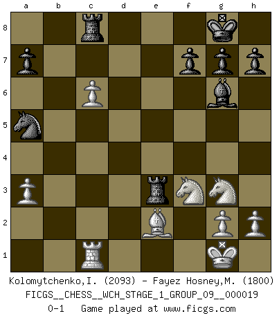 Last move : 0-1 2018 July 10 19:11:57 [Event "FICGS__CHESS__WCH_STAGE_1_GROUP_09__000019"] [Site "FICGS"] [Date "2018.03.23"] [Round "1"] [White "Kolomytchenko,Igor"] [Black "Fayez Hosney,Mohammed"] [Result "0-1"] [WhiteElo "2093"] [BlackElo "1800"] 1.d4 d5 2.c4 e6 3.Nc3 c5 4.cxd5 exd5 5.dxc5 d4 6.Ne4 Nc6 7.a3 Nf6 8.Bg5 Bf5 9.Ng3 Bg6 10.b4 Be7 11.Nf3 O-O 12.Rc1 Re8 13.e3 Ng4 14.Bf4 dxe3 15.fxe3 Bf6 16.Be2 Bb2 17.Qxd8 Raxd8 18.O-O Nxe3 19.Bxe3 Rxe3 20.b5 Bxc1 21.Rxc1 Na5 22.c6 bxc6 23.bxc6 Rc8 0-1 This chess game has been lost on time (started : 2018.03.23 18:24:49) QGD : Tarrasch defense, 4.cd ed Kingside Castling by player Black (move 11) Kingside Castling by player White (move 18) Player Black won this chess game. Follow this game move after move (download)Fischer is under obligation to nobody. (Joseph Platz) Ein unbeabsichtigtes Patt ist der Gipfel der Dummheit. (Anonymous) Una de estas pequeñas movidas modestas pudieran ser mas molestas a tu oponente que la amenaza mas grande. (Siegbert Tarrasch) Nous vivons dans un monde échiquéen : chaque jour qui passe est un défi à relever. (Philosophe Sasha) Good decisions come from experience, and experience comes from bad decisions. (Anonymous)