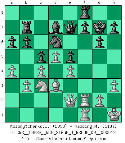 Last move : 1-0 2018 August 9 9:56:31 [Event "FICGS__CHESS__WCH_STAGE_1_GROUP_09__000019"] [Site "FICGS"] [Date "2018.03.23"] [Round "1"] [White "Kolomytchenko,Igor"] [Black "Radding,Marvin"] [Result "1-0"] [WhiteElo "2093"] [BlackElo "1187"] 1.d4 Nf6 2.c4 g6 3.Nc3 Bg7 4.e4 d6 5.Nf3 O-O 6.Be2 b6 7.O-O Bb7 8.Bd3 c5 9.d5 Ng4 10.Bf4 Nd7 11.Be2 Nge5 12.Qd2 Rc8 13.Bh6 a6 14.Bxg7 Kxg7 15.Ne1 Nf6 16.h3 Rb8 17.b3 Qc7 18.f4 Ned7 19.Nf3 e6 20.a4 Bc8 21.Rfd1 e5 22.fxe5 Nxe5 23.Nxe5 dxe5 24.Rf1 Ne8 25.Bd3 Nd6 26.Rf2 Qe7 27.Raf1 Rb7 28.Qe2 Bd7 29.Kh1 1-0 This chess game has been lost on time (started : 2018.03.23 18:24:49) King's Indian : 6.Be2 Kingside Castling by player Black (move 5) Kingside Castling by player White (move 7) Player White won this chess game. Follow this game move after move (download)The enormous mental resilience, without which no Chess player can exist, was so much taken up by Chess that he could never free his mind of this game. (Albert Einstein) Das Schach ist nichts für kleine Geister, es beansprucht einen vollen Mann, der sich nicht sklavisch an das Überlieferte hält, sondern selbständig die Tiefen des Spiels zu ergründen sucht. (Wilhelm Steinitz) Me gusta decir que Bobby Fischer fue el mejor jugador que jamás haya existido. Pero lo que hizo de Fischer un genio, fue su habilidad de mezclar una frescura y pragmatismo Americano con ideas Rusas acerca de la estrategia. (Bruce Pandolfini) Ne tendez aucun piège pour le plaisir ! Ne jouez rien dans l'espoir que l'adversaire réagisse de façon stupide ! Prenez toujours pour acquis que l'adversaire va trouver le meilleur coup ! Ne jouez jamais de coup dans l'espoir que l'adversaire ne voie pas la menace ! Chacun de vos coups doit améliorer la position d'une façon ou d'une autre. We cannot be sure of having something to live for unless we are willing to die for it. (Ernesto Che Guevara)
