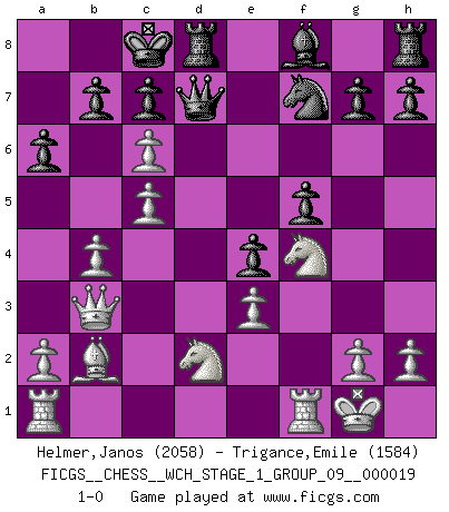 Last move : 1-0 2018 April 28 8:56:56 [Event "FICGS__CHESS__WCH_STAGE_1_GROUP_09__000019"] [Site "FICGS"] [Date "2018.03.23"] [Round "1"] [White "Helmer,Janos"] [Black "Trigance,Emile"] [Result "1-0"] [WhiteElo "2058"] [BlackElo "1584"] 1.Nf3 d5 2.c4 d4 3.b4 f6 4.e3 e5 5.c5 dxe3 6.fxe3 Nc6 7.Qb3 a6 8.Bc4 Nh6 9.Bb2 Qe7 10.Nc3 Bf5 11.Nd5 Qd7 12.d4 e4 13.Nd2 Bg6 14.Nf4 Bf7 15.Bxf7+ Nxf7 16.O-O f5 17.d5 O-O-O 18.dxc6 1-0 Reti : Advance variation Kingside Castling by player White (move 16) Queenside Castling by player Black (move 17) Player White won this chess game. Follow this game move after move (download)You sit at the board and suddenly your heart leaps. Your hand trembles to pick up the piece and move it. But what Chess teaches you is that you must sit there calmly and think about whether it's really a good idea and whether there are other better ideas. (Stanley Kubrick) Schach ist ein schwarz-weisser Dschungel. (Garry Kasparov) Tu cuerpo tiene que estar en óptima condición. Tu Ajedrez se deteriora como lo hace tu cuerpo. No puedes separar la mente y el cuerpo. (Bobby Fischer) Ce n'est pas pour s'amuser qu'il joue aux échecs : il célèbre un culte. (Vladimir Nabokov) The Movers & Shakers of this world are those who play chess in the mornings and go to the disco in the evenings. (Dinesh De Silva)