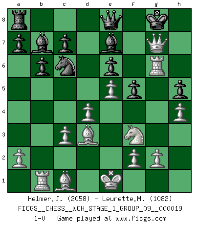 Last move : 1-0 2018 March 28 17:51:26 [Event "FICGS__CHESS__WCH_STAGE_1_GROUP_09__000019"] [Site "FICGS"] [Date "2018.03.23"] [Round "1"] [White "Helmer,Janos"] [Black "Leurette,Marc-Antoine"] [Result "1-0"] [WhiteElo "2058"] [BlackElo "1082"] 1.Nf3 d5 2.c4 Nf6 3.cxd5 Nxd5 4.Nc3 e6 5.e4 Nxc3 6.bxc3 Nc6 7.d4 Be7 8.Rb1 O-O 9.Bd3 b6 10.e5 Bb7 11.h4 h5 12.Rh3 g6 13.Qd2 f5 14.Qh6 Qe8 15.Rg3 Rf7 16.Rxg6+ Rg7 17.Qxg7+ 1-0 Reti Opening Kingside Castling by player Black (move 8) Player White won this chess game. Follow this game move after move (download)The Pawns are the soul of the game. (Francois Andre Danican Philidor) Fischer: 'Remis!?' Uhlmann: 'Aber es muss doch dreimal Zugwiederholung sein!' Fischer: 'Sie nehmen das Remis an, wie ich es sage, sonst spiele ich weiter und werde Sie dann schlagen!' (Robert James Fischer) Aunque la mayoría de la gente disfruta observar las partidas de los grandes Maestros de ataque, algunos de los jugadores mas notables en la historia han sido los jugadores silenciosos posicionales. Lentamente ellos te aplastan despojandote de tu espacio, congestionando tus piezas y dejandote virtualmente sin nada que hacer. (Yasser Seirawan) Mais l'homme est une créature légère et illogique : semblable au joueur d'échecs, il n'aime que le processus du but à atteindre, non le but lui-même. (Dostoïevsky) Always be a first-rate version of yourself, instead of a second-rate version of somebody else. (Judy Garland)