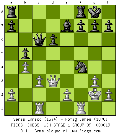 Last move : 0-1 2018 April 17 16:22:8 [Event "FICGS__CHESS__WCH_STAGE_1_GROUP_09__000019"] [Site "FICGS"] [Date "2018.03.23"] [Round "1"] [White "Senis,Enrico"] [Black "Romig,James"] [Result "0-1"] [WhiteElo "1674"] [BlackElo "1878"] 1.d4 Nf6 2.Bf4 e6 3.c3 b6 4.Nf3 Be7 5.Nbd2 Nh5 6.Be3 O-O 7.g3 Bb7 8.Bg2 Nf6 9.O-O c5 10.Qc2 Nd5 11.Nc4 b5 12.Na5 Qxa5 13.Ne5 d6 14.Nd3 Nxe3 15.fxe3 Bxg2 16.Kxg2 Nd7 17.b4 Qc7 18.Qb3 c4 19.Qc2 cxd3 20.Qxd3 Qc6+ 21.e4 Nf6 22.d5 exd5 23.exd5 Nxd5 24.Rac1 Nf4+ 0-1 Queen's pawn game Kingside Castling by player Black (move 6) Kingside Castling by player White (move 9) Player Black won this chess game. Follow this game move after move (download)I guess a certain amount of temperament is expected of Chess geniuses. (Ron Gross) Es ist im Leben wie im Schachspiel. Wir entwerfen einen Plan, dieser bleibt jedoch bedingt durch das, was im Schachspiel dem Gegner, im Leben dem Schicksal zu tun belieben wird. (Arthur Schopenhauer) No volvere nunca a jugar contigo. Has insultado a mi amigo. - cuando un oponente se maldijo por una mala jugada (Miguel Najdorf) Je menace de comprendre la position. (Anonyme) The intuitive mind is a sacred gift; the rational mind is a faithful servant. We have created a society that honors the servant but has forgotten the gift. (Albert Einstein)