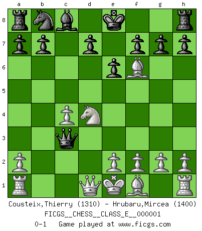 Last move : 0-1 2006 April 12 13:23:18 [Event "FICGS__CHESS__CLASS_E__000001"] [Site "FICGS"] [Date "2006.04.10"] [Round "1"] [White "Cousteix,Thierry"] [Black "Hrubaru,Mircea"] [Result "0-1"] [WhiteElo "1310"] [BlackElo "1400"] 1.d4 Nf6 2.c4 e6 3.Nc3 Bb4 4.Bg5 c5 5.Nf3 cxd4 6.Nxd4 Qa5 7.Bxf6 Bxc3+ 8.bxc3 Qxc3+ 0-1 Nimzo-Indian : Leningrad variation Player Black won this chess game. Follow this game move after move (download)Different people feel differently about resigning. (Bobby Fischer) Capablanka war das größte Genie der Schachgeschichte! Aber denken sie nicht er habe nichts vom Schach verstanden. Er wusste nur soviel wie er wissen musste um seine Ziele zu erreichen. (Mikhail Moiseyevich Botvinik) ¿Cual es el objetivo de jugar una apertura de gambito?... Para adquirir una reputación de ser un jugador apuesto a costo de perder el juego. (Siegbert Tarrasch) L'ordinateur a tué l'originalité. Il n'y a plus guère d'aventures sur l'échiquier. (Jacob Murray) Nothing is more important for teaching us to understand the concepts we have than constructing fictitious ones. (Ludwig Wittgenstein)