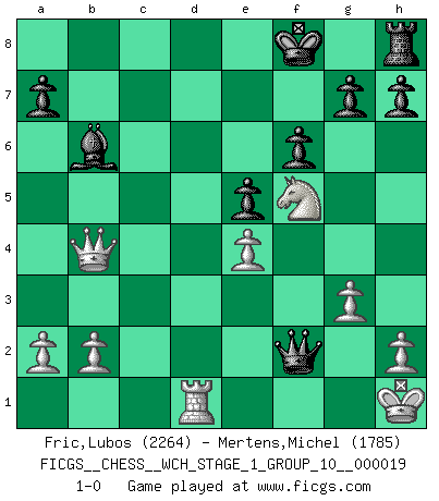 Last move : 1-0 2018 April 24 10:35:54 [Event "FICGS__CHESS__WCH_STAGE_1_GROUP_10__000019"] [Site "FICGS"] [Date "2018.03.23"] [Round "1"] [White "Fric,Lubos"] [Black "Mertens,Michel"] [Result "1-0"] [WhiteElo "2264"] [BlackElo "1785"] 1.Nf3 Nf6 2.g3 d5 3.Bg2 c5 4.O-O Nc6 5.d4 cxd4 6.Nxd4 e5 7.Nxc6 bxc6 8.c4 Bc5 9.cxd5 cxd5 10.Bg5 Be6 11.Nc3 Rc8 12.Bxd5 Bxd5 13.Bxf6 Qxf6 14.Nxd5 Qc6 15.Rc1 Qd7 16.Qd3 f6 17.Qb3 Bb6 18.Rfd1 Rxc1 19.Rxc1 Bd8 20.e4 Kf7 21.Nf4 Ke7 22.Rd1 Qc6 23.Nd5+ Kf8 24.Ne3 Bb6 25.Nf5 Qc5 26.Kh1 Qxf2 27.Qb4+ 1-0 Reti Opening Kingside Castling by player White (move 4) Player White won this chess game. Follow this game move after move (download)Live, lose, and learn, by observing your opponent how to win. (Amber Steenbock) Die jungen Leute sollen verstehen, dass sie noch etwas von mir lernen können und müssen. (Viktor Kortschnoi) En manos de Fischer's, una diminuta ventaja teórica es tan buena como tener una Reina de ventaja. (Isaac Kashdan) Les pièces de l'échiquier étaient impitoyables. Elles le retenaient, elles l'absorbaient. Il y avait de l'horreur en cela, mais aussi une harmonie unique. Car, qu'y a-t-il dans le monde, à part les échecs ? (V. Nabokov) Creativity is allowing yourself to make mistakes. Art is knowing which ones to keep. (Scott Adams)