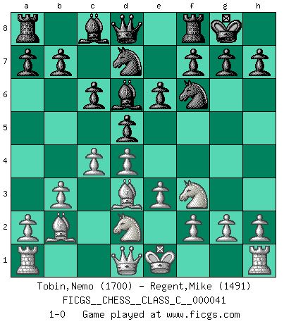 Last move : 1-0 2007 July 30 7:23:51 [Event "FICGS__CHESS__CLASS_C__000041"] [Site "FICGS"] [Date "2007.05.01"] [Round "1"] [White "Tobin,Nemo"] [Black "Regent,Mike"] [Result "1-0"] [WhiteElo "1700"] [BlackElo "1491"] 1.d4 d5 2.c4 c6 3.Nf3 Nf6 4.e3 e6 5.Nbd2 Nbd7 6.Bd3 Bd6 7.b3 O-O 8.Bb2 1-0 This chess game has been lost on time (started : 2007.05.01 6:0:0) QGD Slav : 4.e3 Kingside Castling by player Black (move 7) Player White won this chess game. Follow this game move after move (download)The Chess pieces are the block alphabet which shapes thoughts; and these thoughts, although making a visual design on the chessboard, express their beauty abstractly, like a poem. (Marcel Duchamp) Er war ein guter Schachspieler, aber ich kann Leute nicht ausstehen, die 'Heil Hitler' rufen (Über Alexander Aljechin). (Miguel Najdorf) Nada excita más a Grandes Maestros aburridos que una novedad teórica. (Dominic Lawson) Toutes les manuvres exécutées sur une colonne ouverte ont pour but ultime l'intrusion définitive sur la septième ou la huitième rangée, en plein cur de la position ennemie. (Aaron Nimzovitch) When the going gets tactical, the computers get going. (Hyatt)