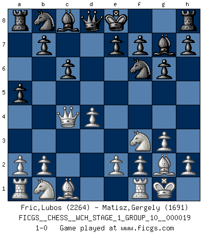 Last move : 1-0 2018 May 2 10:30:26 [Event "FICGS__CHESS__WCH_STAGE_1_GROUP_10__000019"] [Site "FICGS"] [Date "2018.03.23"] [Round "1"] [White "Fric,Lubos"] [Black "Matisz,Gergely"] [Result "1-0"] [WhiteElo "2264"] [BlackElo "1691"] 1.Nf3 d5 2.g3 a5 3.Bg2 g6 4.O-O Bg7 5.d4 Nf6 6.c4 dxc4 7.Qa4+ c6 8.Qxc4 1-0 This chess game has been lost on time (started : 2018.03.23 18:24:53) Reti : King's Indian attack (Barcza system) Kingside Castling by player White (move 4) Player White won this chess game. Follow this game move after move (download)I like to say that Bobby Fischer was the greatest player ever. But what made Fischer a genius was his ability to blend an American freshness and pragmatism with Russian ideas about strategy. (Bruce Pandolfini) Habe Mut, dich deines eigenen Verstandes zu bedienen. (Immanuel Kant) Yo nunca en mi vida he jugado la Defensa Francesa, que viene siendo la más aburrida de todas las Aperturas. (Wilhelm Steinitz) Que feriez-vous si vous étiez en train de jouer aux échecs et que la fin du monde arrive ? Je continuerais à jouer. (Saint Borromée) I would love to change the world, but they won't give me the source code. (Unknown)