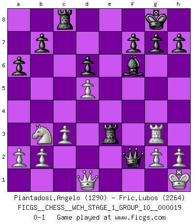 Last move : 0-1 2018 April 22 1:3:59 [Event "FICGS__CHESS__WCH_STAGE_1_GROUP_10__000019"] [Site "FICGS"] [Date "2018.03.23"] [Round "1"] [White "Piantadosi,Angelo"] [Black "Fric,Lubos"] [Result "0-1"] [WhiteElo "1290"] [BlackElo "2264"] 1.e4 c5 2.Nf3 d6 3.d4 cxd4 4.Nxd4 Nf6 5.Nc3 a6 6.Be2 e5 7.Nb3 Be7 8.O-O O-O 9.Be3 Be6 10.f4 exf4 11.Bxf4 Nc6 12.Bf3 Rc8 13.Qd2 Re8 14.Rad1 Ne5 15.Nd5 Nxf3+ 16.Rxf3 Nxd5 17.exd5 Bg4 18.Rg3 Bxd1 19.Qxd1 Bf6 20.c3 Qb6+ 21.Kh1 Qf2 22.Be3 Rxe3 0-1 Sicilian : Najdorf, Opovcensky variation Kingside Castling by player White (move 8) Kingside Castling by player Black (move 8) Player Black won this chess game. Follow this game move after move (download)It was clear to me that the vulnerable point of the American Grandmaster (Bobby Fischer) was in double-edged, hanging, irrational positions, where he often failed to find a win even in a won position. (Efim Geller) Ich trinke, ich rauche, ich spiele, ich liebe Frauen aber Fernschach ist ein Laster, das ich nicht habe. (Mikhail Nekhemyevich Tal) El pensamiento metódico es mas útil en el Ajedrez que la inspiración. (C. J. S. Purdy) Aux échecs, les retours au sommet sont rares : les dommages psychologiques consécutifs à une défaite sont trop sévères. (Daily Telegraph) As a goal marker shodan is important. As a destination it is a poor place to stop. (Thomas Tamayo)
