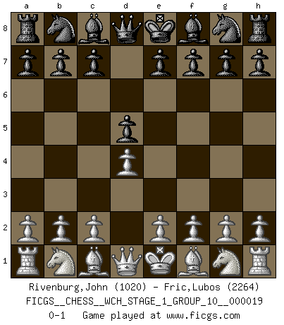 Last move : 0-1 2018 April 24 9:50:30 [Event "FICGS__CHESS__WCH_STAGE_1_GROUP_10__000019"] [Site "FICGS"] [Date "2018.03.23"] [Round "1"] [White "Rivenburg,John"] [Black "Fric,Lubos"] [Result "0-1"] [WhiteElo "1020"] [BlackElo "2264"] 1.d4 d5 0-1 This chess game has been lost on time (started : 2018.03.23 18:24:53) Queen's pawn game Player Black won this chess game. Follow this game move after move (download)If your opponent cannot do anything active, then don't rush the position; instead you should let him sit there, suffer, and beg you for a draw. (Jeremy Silman) Ich moechte nie einem Club beitreten, der Leute wie mich als Mitglieder aufnimmt. (Woody Allen) La maestría del Ajedrez consiste esencialmente en analizar posiciónes de Ajedrez con precisión. (Mikhail Botvinnik) Toutes les manuvres exécutées sur une colonne ouverte ont pour but ultime l'intrusion définitive sur la septième ou la huitième rangée, en plein cur de la position ennemie. (Aaron Nimzovitch) When the going gets tactical, the computers get going. (Hyatt)
