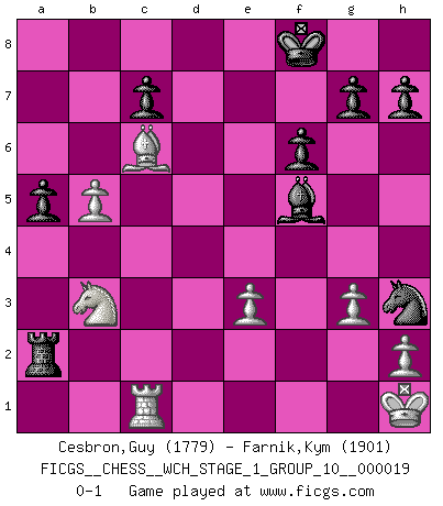 Last move : 0-1 2018 June 8 1:57:46 [Event "FICGS__CHESS__WCH_STAGE_1_GROUP_10__000019"] [Site "FICGS"] [Date "2018.03.23"] [Round "1"] [White "Cesbron,Guy"] [Black "Farnik,Kym"] [Result "0-1"] [WhiteElo "1779"] [BlackElo "1901"] 1.c4 Nf6 2.Nc3 e5 3.Nf3 Nc6 4.g3 d5 5.cxd5 Nxd5 6.Bg2 Nb6 7.O-O Be7 8.a3 O-O 9.b4 Be6 10.Rb1 f6 11.d3 a5 12.b5 Nd4 13.Nd2 Qc8 14.e3 Nf5 15.Qe2 Nd6 16.Rd1 Rd8 17.Bb2 Nf7 18.Nc4 Nxc4 19.dxc4 Rxd1+ 20.Qxd1 Rb8 21.Qa4 Bh3 22.Bd5 Kf8 23.c5 Ng5 24.c6 bxc6 25.Bxc6 Qf5 26.f4 exf4 27.Qxf4 Qe6 28.Bd5 Qd7 29.Bc6 Qd2 30.Qf2 Rd8 31.Qxd2 Rxd2 32.Na4 Bf5 33.Rc1 Nh3+ 34.Kh1 Re2 35.Rf1 Bd3 36.Rc1 Bd6 37.Bd4 Bxa3 38.Bc5+ Bxc5 39.Nxc5 Bf5 40.Nb3 Ra2 0-1 English Opening Kingside Castling by player White (move 7) Kingside Castling by player Black (move 8) Player Black won this chess game. Follow this game move after move (download)The defensive power of a pinned piece is only imaginary. (Aaron Nimzovich) Ich bewundere Kasparows phantasievolle Angriffssiege aus den Achtzigern und Neunzigern, aber wenn man sie mit dem Computer überprüft, nimmt der Computer in jeder zweiten Partie die Opfer an, verteidigt sich und gewinnt. (Vladimir Kramnik) Ciertamente, de todas la drogas del mundo, el Ajedrez debe ser el mas placentero permamentemente. (Assiac) Ce n'est pas pour s'amuser qu'il joue aux échecs : il célèbre un culte. (Vladimir Nabokov) I don't believe in psychology. I believe in good moves. (Bobby Fischer)