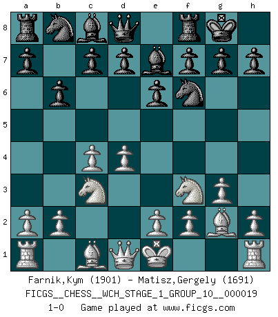 Last move : 1-0 2018 April 28 22:4:1 [Event "FICGS__CHESS__WCH_STAGE_1_GROUP_10__000019"] [Site "FICGS"] [Date "2018.03.23"] [Round "1"] [White "Farnik,Kym"] [Black "Matisz,Gergely"] [Result "1-0"] [WhiteElo "1901"] [BlackElo "1691"] 1.d4 Nf6 2.c4 e6 3.Nf3 b6 4.g3 Be7 5.Nc3 O-O 6.Bg2 1-0 This chess game has been lost on time (started : 2018.03.23 18:24:53) Queen's Indian : 4.g3 Kingside Castling by player Black (move 5) Player White won this chess game. Follow this game move after move (download)You can only get good at Chess if you love the game. (Bobby Fischer) Schach ist eine Sache der genauen Beurteilung, wann man zuschlagen und wann man sich ducken muss. (Robert James Fischer) Robert Fischer es la ley hacia si mismo. (Larry Evans) Comme les marins qui ont mille raisons différentes d'aller en mer, les joueurs d'échecs en ont tout autant avant de s'installer devant une table et jouer... (Vincent Bertignac, philosophe) Don't be discouraged. It's often the last key in the bunch that opens the lock. (Author unknown)