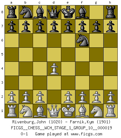 Last move : 0-1 2018 April 24 9:50:30 [Event "FICGS__CHESS__WCH_STAGE_1_GROUP_10__000019"] [Site "FICGS"] [Date "2018.03.23"] [Round "1"] [White "Rivenburg,John"] [Black "Farnik,Kym"] [Result "0-1"] [WhiteElo "1020"] [BlackElo "1901"] 1.d4 Nf6 0-1 This chess game has been lost on time (started : 2018.03.23 18:24:53) Queen's pawn game Player Black won this chess game. Follow this game move after move (download)In life, as in Chess, one's own Pawns block one's way. A man's very wealth, ease, leisure, children, books, which should help him to win, more often checkmate him. (Charles Buxton) Ich habe Putins Aufstieg an die Macht beobachtet und seine Politik, die demokratischen Institutionen meines Landes zu zerstören. (Garry Kasparov) Para mi, el Ajedrez es la vida y cada partida es como una nueva vida. Todo jugador de Ajedrez suele vivir muchas vidas durante su vida. (Eduard Gufeld) La vie est comme un jeu d'échecs : nous esquissons un plan, mais celui-ci est tributaire de ce que daignent faire l'adversaire aux échecs et le destin dans la vie. (Arthur Schopenhauer) Two beer, or not two beer. (Unknown)