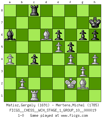 Last move : 1-0 2018 June 30 16:17:51 [Event "FICGS__CHESS__WCH_STAGE_1_GROUP_10__000019"] [Site "FICGS"] [Date "2018.03.23"] [Round "1"] [White "Matisz,Gergely"] [Black "Mertens,Michel"] [Result "1-0"] [WhiteElo "1691"] [BlackElo "1785"] 1.d4 d5 2.c4 e6 3.Nc3 c5 4.cxd5 cxd4 5.Qxd4 Nc6 6.Qd2 Nf6 7.dxc6 Qxd2+ 8.Bxd2 Bc5 9.g3 bxc6 10.Nf3 O-O 11.Bg2 Bb7 12.O-O Rfd8 13.Rac1 Bb6 14.Rfd1 h6 15.Ne5 Nd5 16.Ne4 Rab8 17.Nc5 Ba8 18.Ncd7 Rbc8 19.e4 Ne7 20.Nxb6 axb6 21.Be3 c5 22.Nc4 b5 23.Rxd8+ Rxd8 24.Bxc5 bxc4 25.Bxe7 Rc8 26.a4 Bb7 27.e5 Ba6 28.Bd6 Kh7 29.f4 f5 30.h4 g6 31.Kf2 1-0 QGD : Tarrasch, von Hennig-Schara gambit Kingside Castling by player Black (move 10) Kingside Castling by player White (move 12) Player White won this chess game. Follow this game move after move (download)Many Chess players were surprised when after the game, Fischer quietly explained: 'I had already analyzed this possibility' in a position which I thought was not possible to foresee from the opening. (Mikhail Tal) Die größte Kunst beim Schach besteht darin dem Gegner nicht zu zeigen was er tun kann. (Garry Kasparov) Una clavada es mas poderosa que una espada. (Fred Reinfeld) Tout change constamment, y compris dans le monde des Echecs. (Botvinnik) The weakness of an artist is dogma. (Josh Waitzkin)