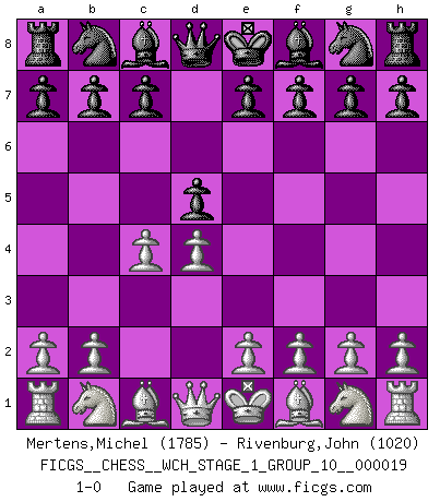 Last move : 1-0 2018 April 25 9:54:13 [Event "FICGS__CHESS__WCH_STAGE_1_GROUP_10__000019"] [Site "FICGS"] [Date "2018.03.23"] [Round "1"] [White "Mertens,Michel"] [Black "Rivenburg,John"] [Result "1-0"] [WhiteElo "1785"] [BlackElo "1020"] 1.d4 d5 2.c4 1-0 This chess game has been lost on time (started : 2018.03.23 18:24:53) Queen's Gambit Player White won this chess game. Follow this game move after move (download)Avoid the crowd. Do your own thinking independently. Be the Chess player, not the Chess piece. (Ralph Charell) Kein Großmeister ist normal. Sie unterscheiden sich nur im Ausmaß Ihrer Verrücktheit. (Viktor Kortschnoi) El juego de Damas es para vagabundos. (Paul Morphy) Des points faibles ou des trous dans la position de l'adversaire doivent être occupés par des pièces et non pas par des pions. (Siegbert Tarrasch) Work expands to fill the time available. (C. Northcote Parkinson, in Parkinson's Laws)