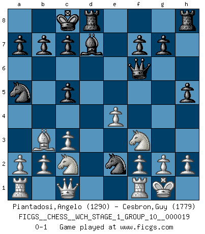 Last move : 0-1 2018 April 26 21:7:7 [Event "FICGS__CHESS__WCH_STAGE_1_GROUP_10__000019"] [Site "FICGS"] [Date "2018.03.23"] [Round "1"] [White "Piantadosi,Angelo"] [Black "Cesbron,Guy"] [Result "0-1"] [WhiteElo "1290"] [BlackElo "1779"] 1.e4 e5 2.Nf3 Nc6 3.d4 exd4 4.Nxd4 Bc5 5.c3 Qf6 6.Be3 Nge7 7.Nc2 d6 8.Bxc5 dxc5 9.Be2 Bd7 10.O-O O-O-O 11.Qc1 h5 12.Nd2 Ng6 13.Nf3 Nf4 14.Bc4 Na5 15.Bb3 Ne2+ 0-1 Scotch game Kingside Castling by player White (move 10) Queenside Castling by player Black (move 10) Player Black won this chess game. Follow this game move after move (download)A bad day of Chess is better than any good day at work. (Anonymous) Frage des Reporters: -Welche besonderen Umstände rechtfertigen das Anhalten der Uhren während einer Turnierpartie? Antwort: -Einen Fotographen zu strangulieren. (Siegbert Tarrasch) Un jugador que es sorprendido, esta derrotado a medias. (Proverbio) Toutes les manuvres exécutées sur une colonne ouverte ont pour but ultime l'intrusion définitive sur la septième ou la huitième rangée, en plein cur de la position ennemie. (Aaron Nimzovitch) Life is like internet, nothing interesting, but noone want to leave it. (Ilmars Cirulis)